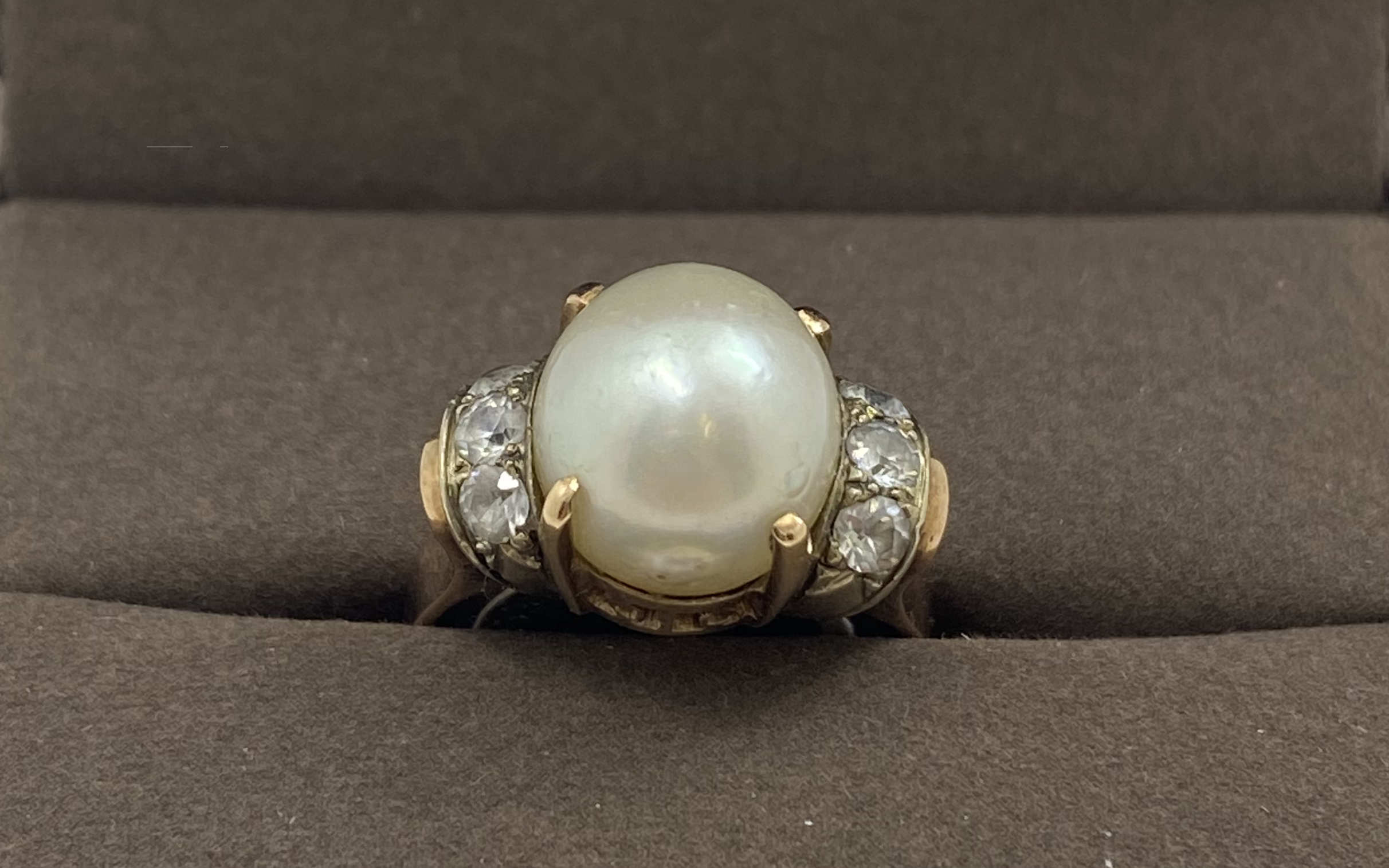 | 14c rose gold set with big central pearl surrounded by 3 cubic zirconias on each side | |